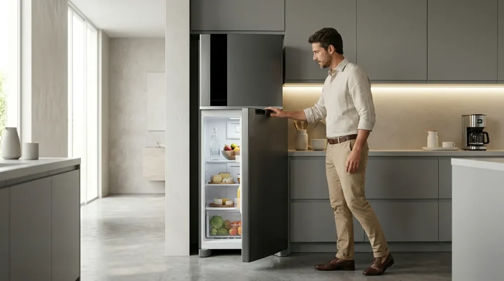 É importante considerar não só a largura da geladeira, mas também o espaço lateral para a abertura total das portas, principalmente em cozinhas com paredes próximas ou obstáculos ao lado.
